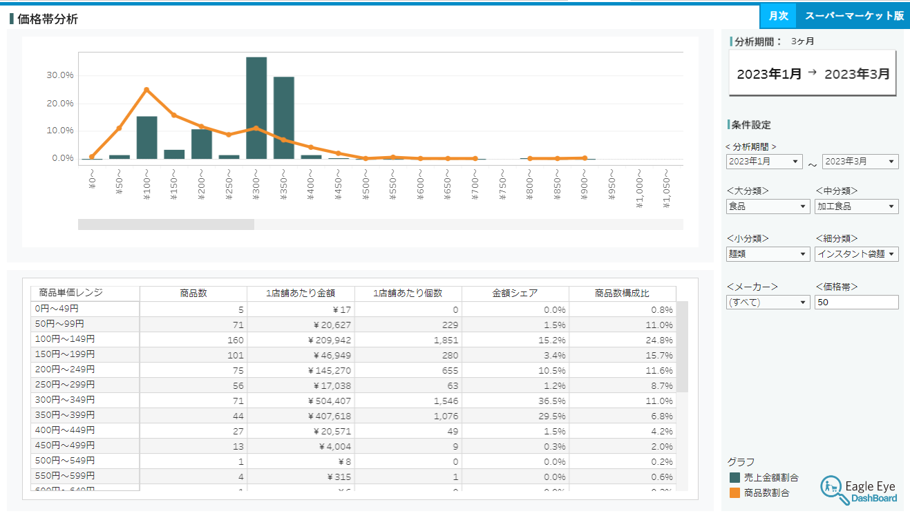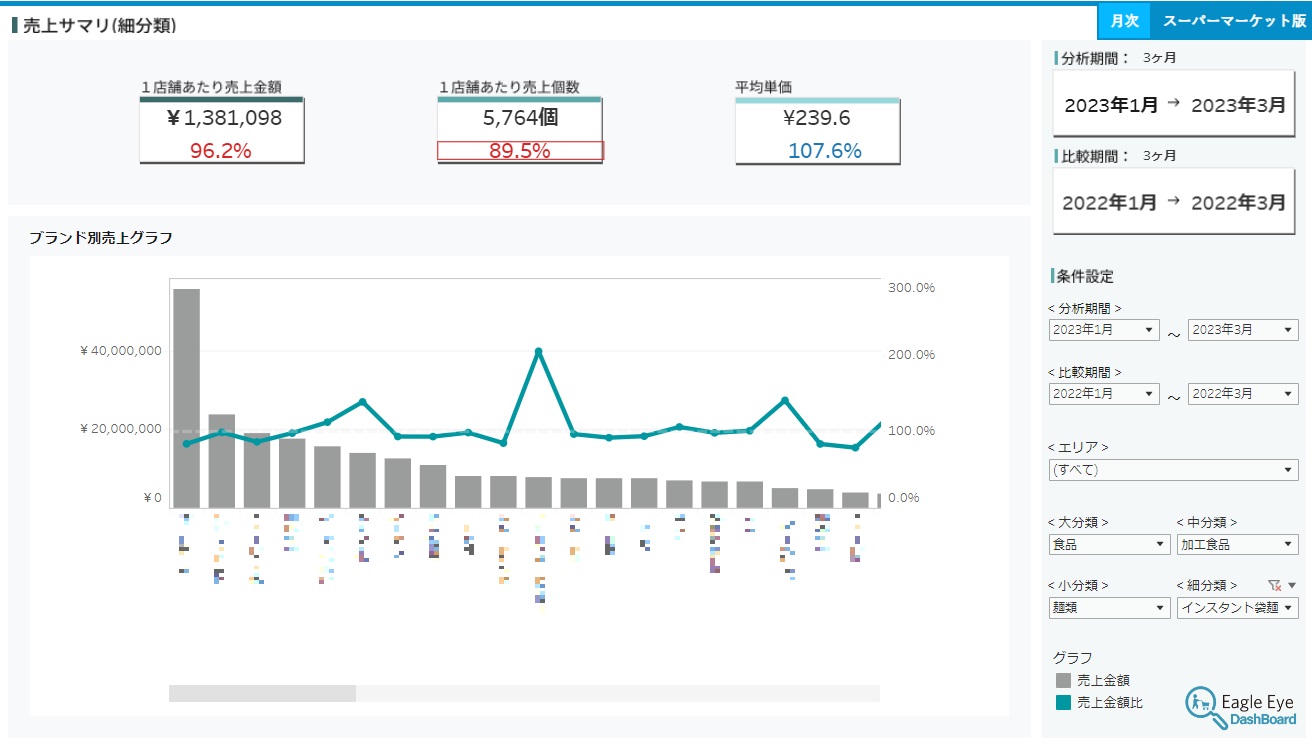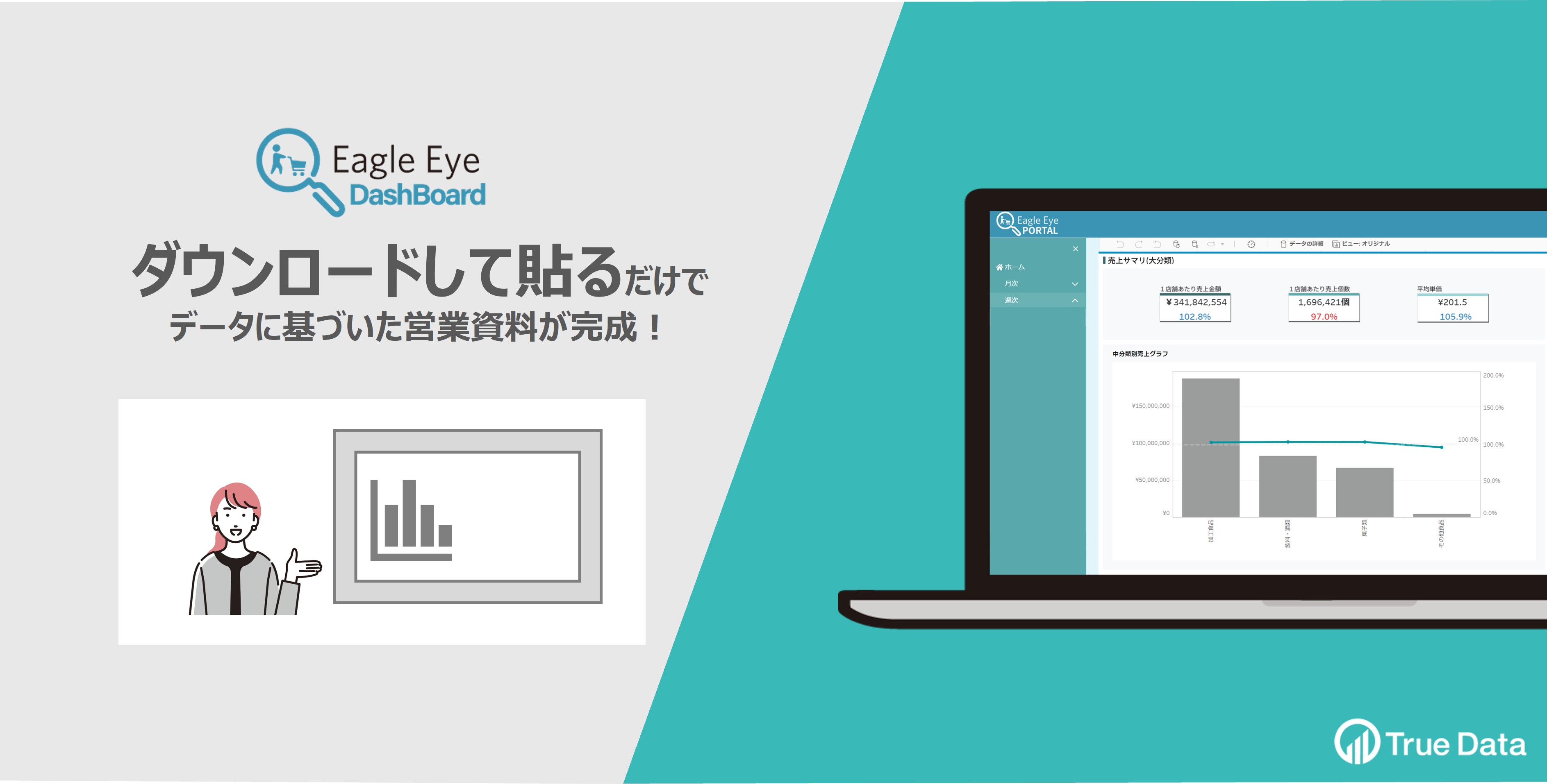 True Dataではこうした課題解決に向けて、統計の知識がなくても、クリックするだけで誰でも簡単に全国規模の売上情報をチェックでき、そのまま営業資料などに活用できるツールである「イーグルアイダッシュボード」を開発した。売上げの概要や推移、ランキング、地域や価格帯別の動向や成長率などの分析メニューを備えていて、クリックするだけで営業資料づくりや定点観測に欠かせないマーケティングデータが自動表示される。