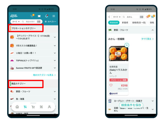 検索機能のアップデートは主に2つ。一つ目は、カテゴリーレイアウトのアップデートで、カテゴリーの表示を「プロモーションカテゴリー」と「商品カテゴリー」に分類し、これまで以上に買い物の目的に合わせた商品検索が可能になった。また、各カテゴリーのアイコンも、一目で認識できるデザインにリニューアルした。
