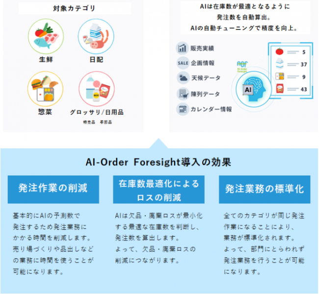 そこで「AI-Order Foresight」を活用することによって、AIが自動でピックアップした商品を確認するだけで発注が行えるようになるため、大幅な発注時間の削減となる。スキルや経験が異なる担当者ごとの品揃えのバラつきを平準化するとともに、商品の過剰発注や発注不足を減らし、販売機会ロスや食品廃棄ロスを削減する。