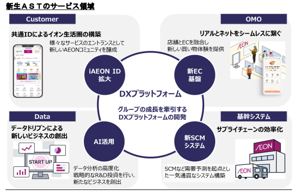 新生ASTによって、バックエンドからフロントまで一貫したサービスの提供を目指す。グループトータルアプリであるiAEONをはじめデジタルサービスを一体運営する。両社が保有するさまざまなソリューションの融合および最新のデジタル技術によって、新たなサービス領域を創出し、グループシナジーの最大化を図る。