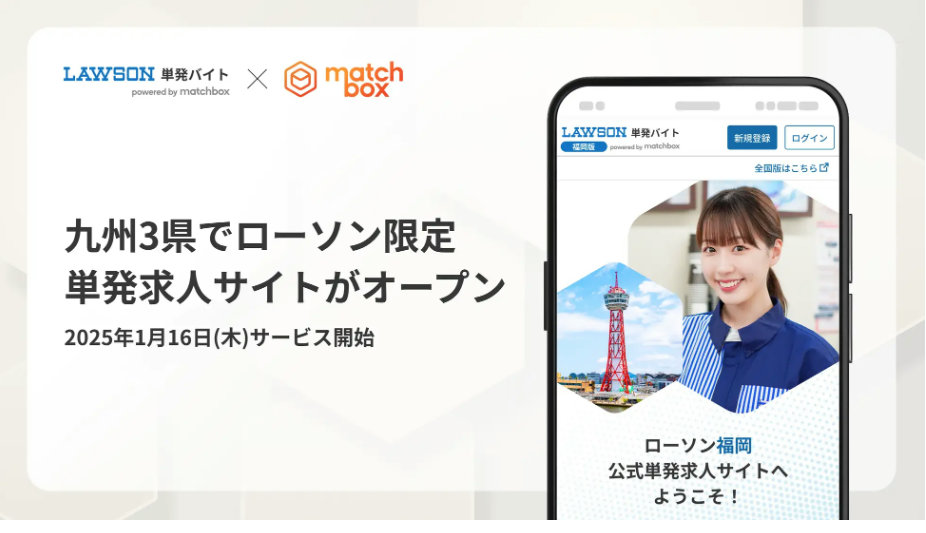 (株)ローソン(東京都品川区、竹増貞信社長)の合弁会社であるローソンスタッフ(株)(新潟県中央区、佐藤洋彰社長)と(株)Matchbox Technologies(マッチボックステクノロジーズ)は、1月16日(木)から、福岡・熊本・宮崎で短期・単発アルバイト専用求人サイト「ローソンマッチボックス福岡県版・熊本県版・宮崎県版」をオープンする。九州エリア対象のサイトがオープンするのは今回が初となる。