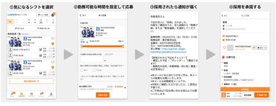 また働き手は、店舗との合意のもとアプリ上で自分が働きやすい店舗をお気に入り登録することで、非公開求人の閲覧・応募を優先的に実施できる。店舗側は、お気に入り登録をする働き手を集めることで、柔軟な働き方の選択肢を提供しながら既存従業員と同等の信頼性がある人材を確保することができる。