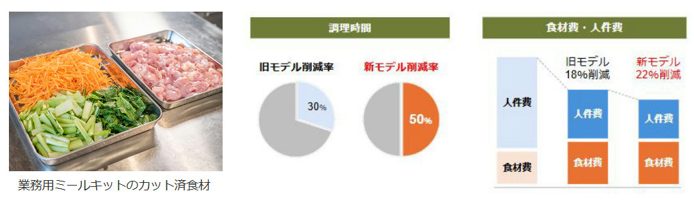 これまで野菜原体で届けていたものをカット済みの状態で届けることで、日によって100%、40%とばらつきがあったカット野菜の比率が、常時80%以上の比率で届けることが可能となった。さらに、肉類は加熱済の唐揚げや成形・味付け済のハンバーグなど、園での調理時間を削減できる食材も導入。おやつもホットケーキなどを調理済みの状態で届けることで、ミールキット導入前と比べて調理時間を最大50%、食材費・人件費の総額を最大22%削減することが可能となった。
