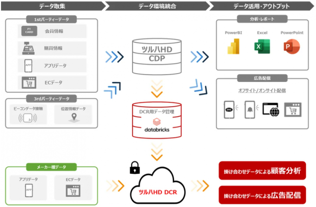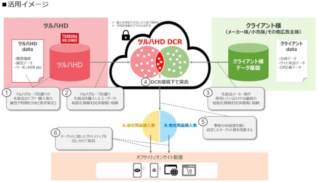 プライバシーに配慮しながら自社データの分析を進める手法の一つとしてDCRが注目されるようになった。DCRの活用によって、広告主であるブランドメーカー各社が保有するデータと、ツルハグループが保有する顧客の来店、購買データをセキュアな環境で突合をさせながら、高度な顧客分析や精度の高い広告配信の実現を目指す。