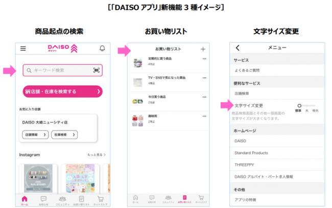 (株)大創産業(広島県東広島市、矢野靖二社長)は2月27日(木)、「DAISO アプリ」に3つの新機能を搭載した。一つ目は「商品起点の在庫検索機能の拡張」、二つ目は「お買い物リスト」、そして三つ目が「文字サイズ変更」。