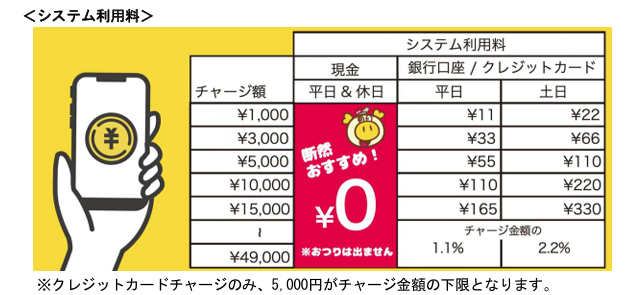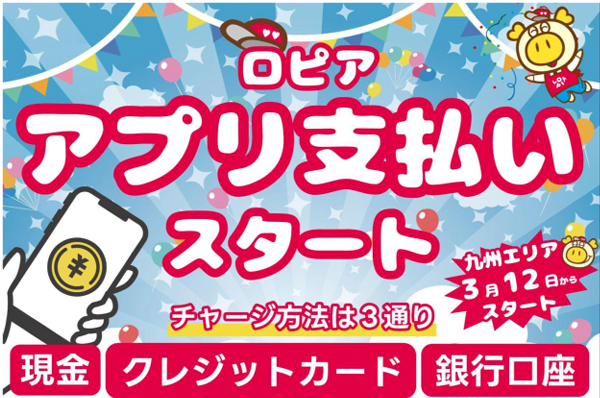 「ロピア 公式アプリ」でのキャッシュレス支払い機能は、現金、クレジットカード、銀行口座のいずれかの方法で、事前にチャージして利用する。クレジットカード、銀行口座によるチャージの場合はシステム利用料がかかる。