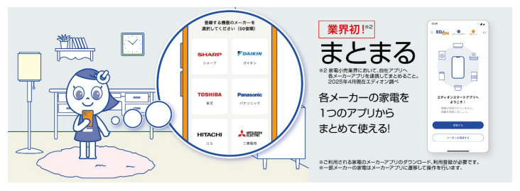さらに、エディオン以外で購入した異なる機種・メーカーの家電もまとめて操作することができる、無料アプリとなる。