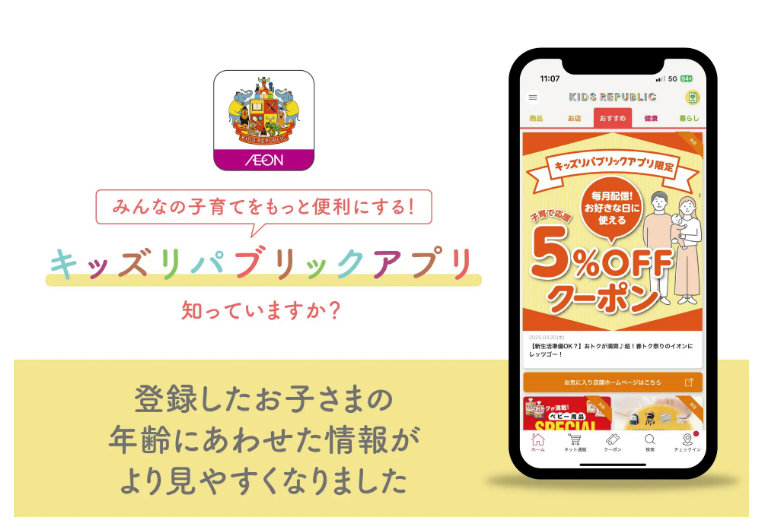 イオン(株)(千葉市美浜区、吉田昭夫社長)は4月9日(水)から、子育て応援アプリ「キッズリパブリックアプリ」をリニューアルする。