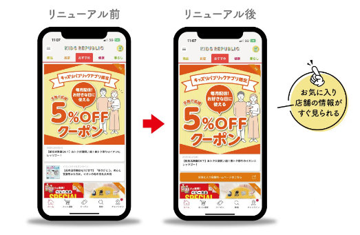 2つ目は、ホーム画面に「お気に入り店舗」のホームページへのボタンを新設。店舗の情報により早くたどりつけるようになる。