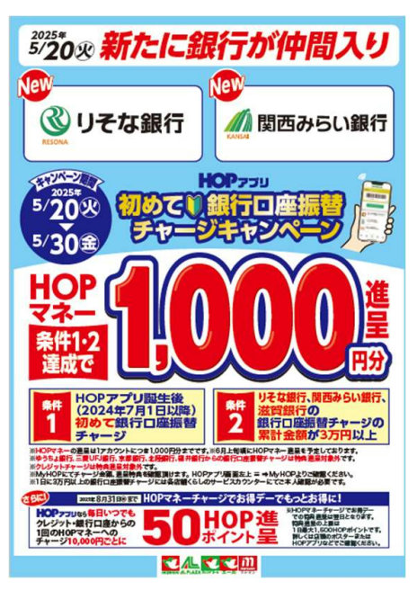 「りそな銀行」「関西みらい銀行」の 2行が新たに仲間入りしたことを記念し、初めての銀行口座振替チャージを利用し、振替チャージの累計金額が3万円以上の人に 1000円分の HOP マネーを進呈するキャンペーンを開催する。期間は5月20日(火)~5月30日(金)まで。