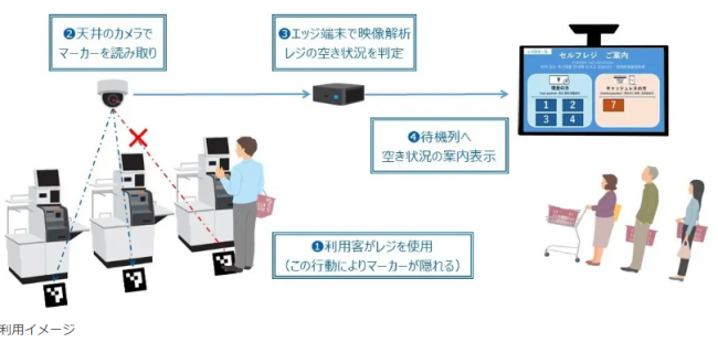 TOPPANホールディングスのグループ会社であるTOPPAN(株)の仕組みを活用したもの。スーパーマーケットや量販店などの小売業の現場での利用を想定していて、空いているセルフレジを天井カメラで自動検知し、サイネージを用いて空き情報を利用客に知らせるシステム。