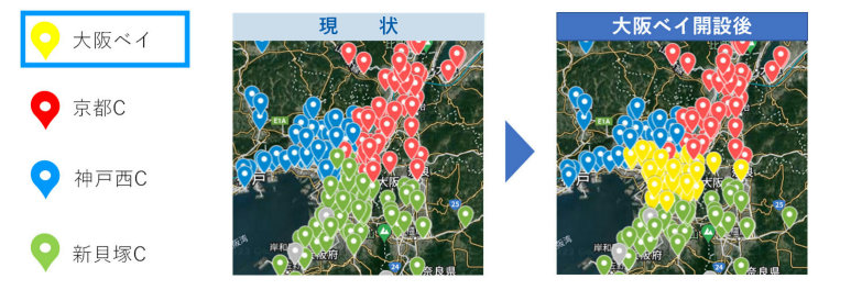 ①現在、新貝塚・京都・神戸西の3センターで管轄している配送の一部を大阪ベイに分散することで配送距離は約50%の短縮を見込む