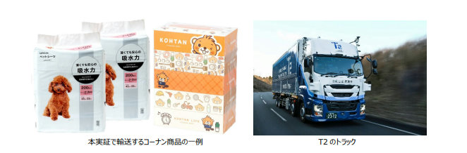 実証では、「T2」が7⽉から商⽤運⾏で使⽤している「レベル 2⾃動運転トラック」を使用して、「コーナン」で販売する⼯具や家庭雑貨品など⾃社ブランド商品を輸送し、技術⾯・オペレーション⾯で持続可能な物流体制を構築していけるかを検証する。