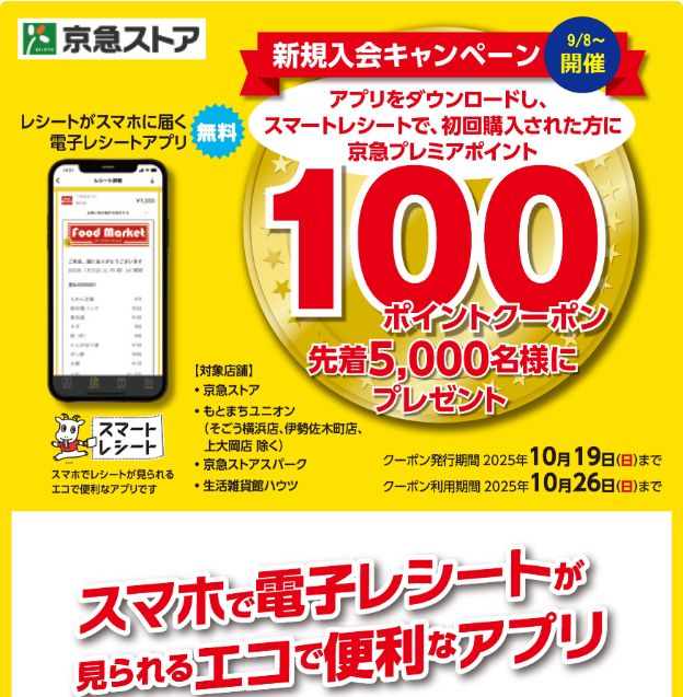 新規導入に合わせて、新規入会キャンペーンを9月8日(月)~10月19日(日)の期間実施している。期間中に対象店舗でスマートレシートアプリの利用客先着5000名に、京急プレミアポイント100ポイントプレゼントクーポンを発行するもの。
