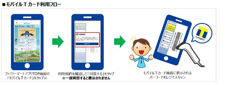 これにより、全国のファミリーマート・サークルK・サンクス約1万8000店で、スマートフォンの画面のバーコードを提示することで、通常のファミマTカード、Tカードと同様、Tポイントサービスが利用できるようになる。