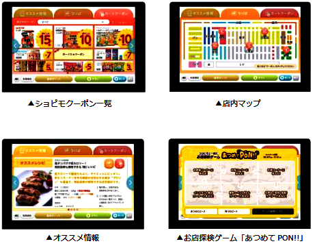 「ショピモ」はショッピングカートに取り付けられたタブレット端末画面で、ショピモ限定のクーポン、ゲーム、店舗オススメ情報、店内マップ、レジ待ちアンケートなどのコンテンツを顧客に配信し、便利でお得な新しい買物体験を提供するために開発された。