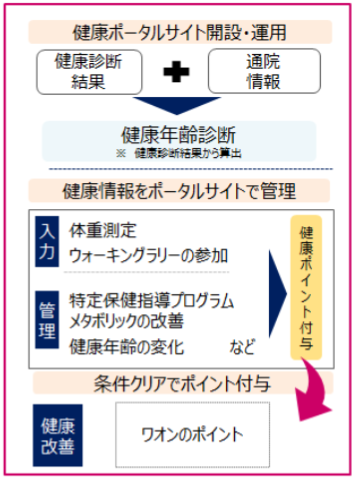 健康ポータルサイトには、従業員の健康診断結果や健康に関する自主的なアクションによる健康改善状況が記録される。その情報を分析することで、健康診断の12項目(血圧、血糖値など)で算出された「健康年齢」を基準に、健康改善などのアドバイスが行われる。また健康改善の度合によって、健康ポイントが付与される。この健康ポイントはワオンポイントに交換できる仕組みだ。