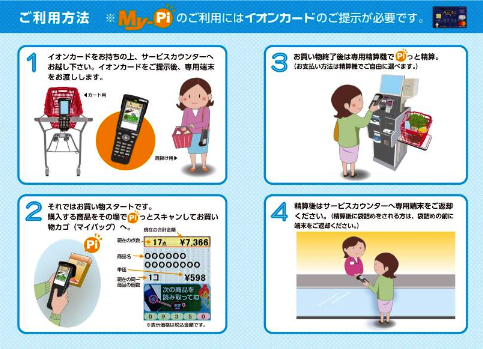 「マイピ」は、店舗が貸出しする専用端末によって、顧客が購入商品をその場でスキャンしながら買物するサービスである。買物終了後は専用端末を精算機に読み込ませるだけで、スピーディに会計が完了する。サービス利用の際には、イオンクレジットカードの提示が必要となる。