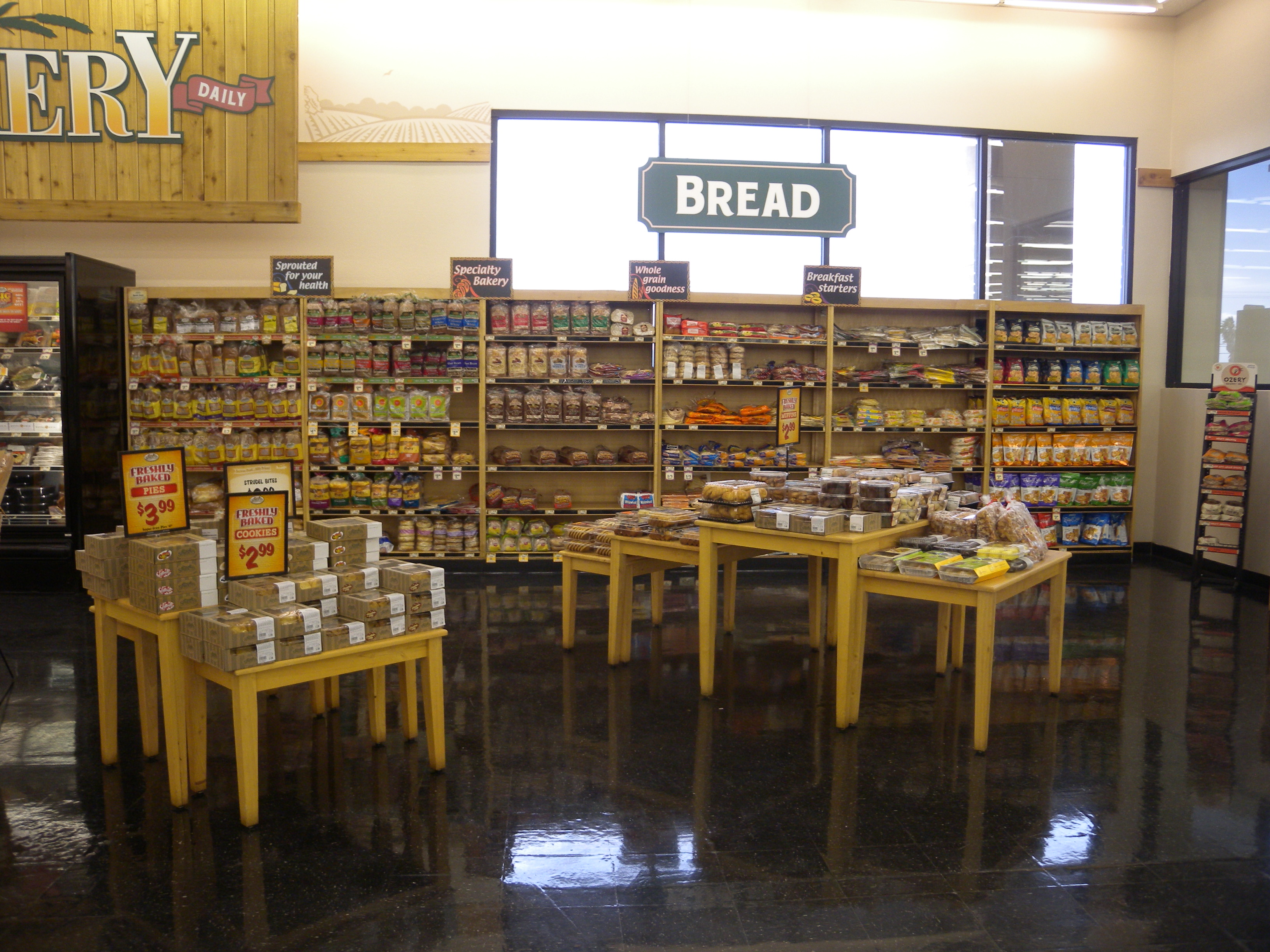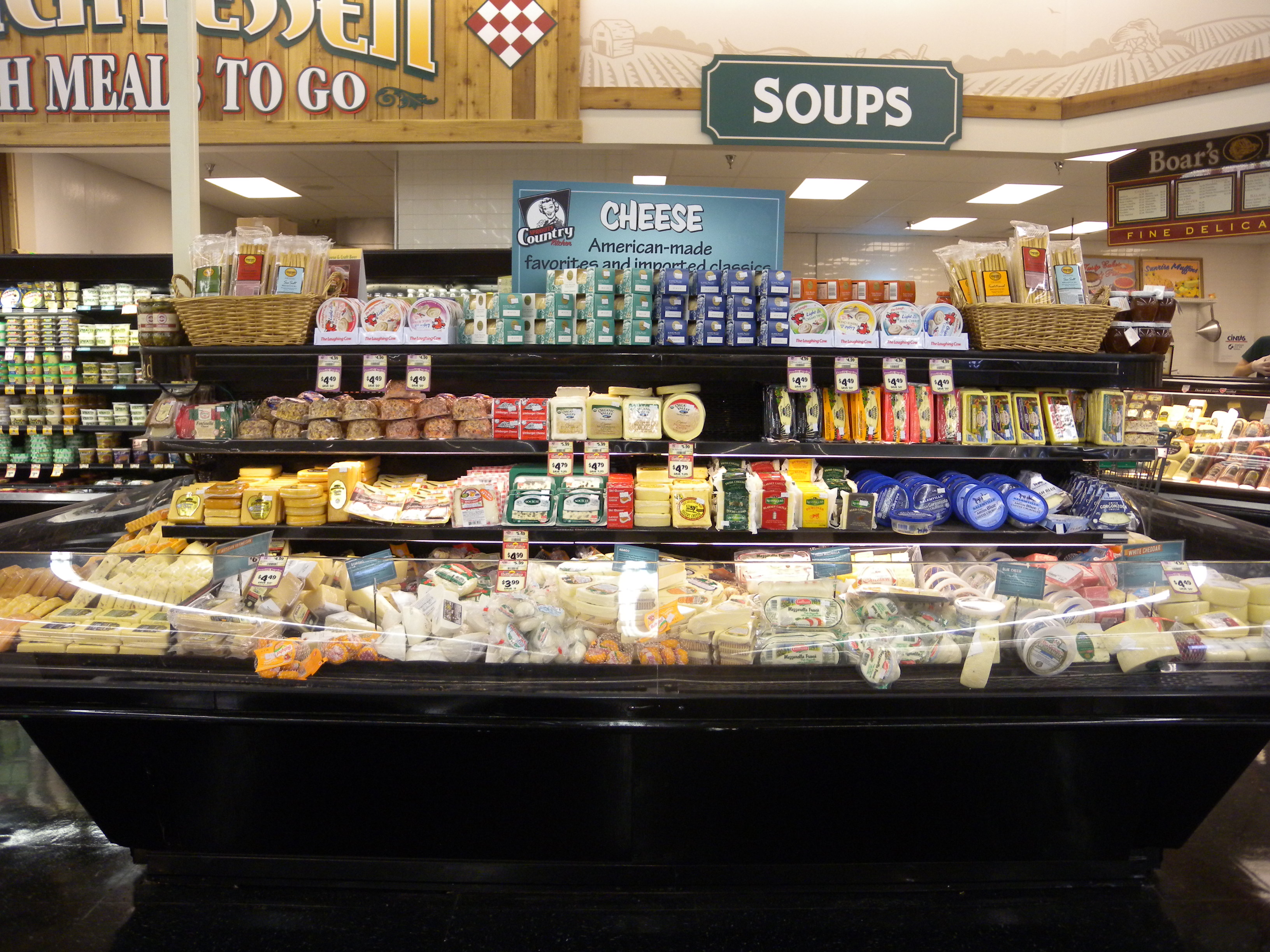 両翼壁面沿いにベーカリー、ミート、乳製品、デリ、飲料、