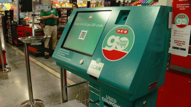 アプリ「H-E-B Go」を事前にインストールしたスマートフォンで商品スキャンしながら買物をし、出入口付近に設置されている決済キオスクでQRコードを読み取り、チェックアウト(支払)する仕組みだ。