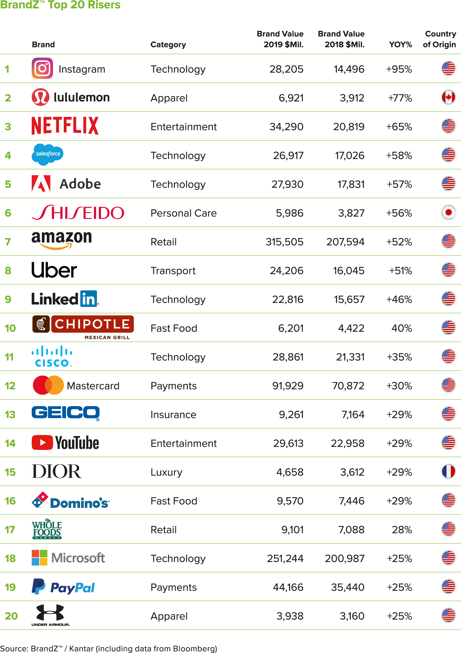 一方、急成長したブランドランキングでは、1位にSNSのInstagram (インスタグラム)、2位にLululemon(ルルレモン)が入っている。インスタグラムは10億人超にまでユーザーを増やしている。ルルレモンはヨガを中心としたアスリート向けのアパレルやグッズを販売して大人気のカナダのブランドだ。日本のブランドではShiseido(資生堂)がそのブランド価値を大きく伸ばしているが、TOP100にはランクインしていない。