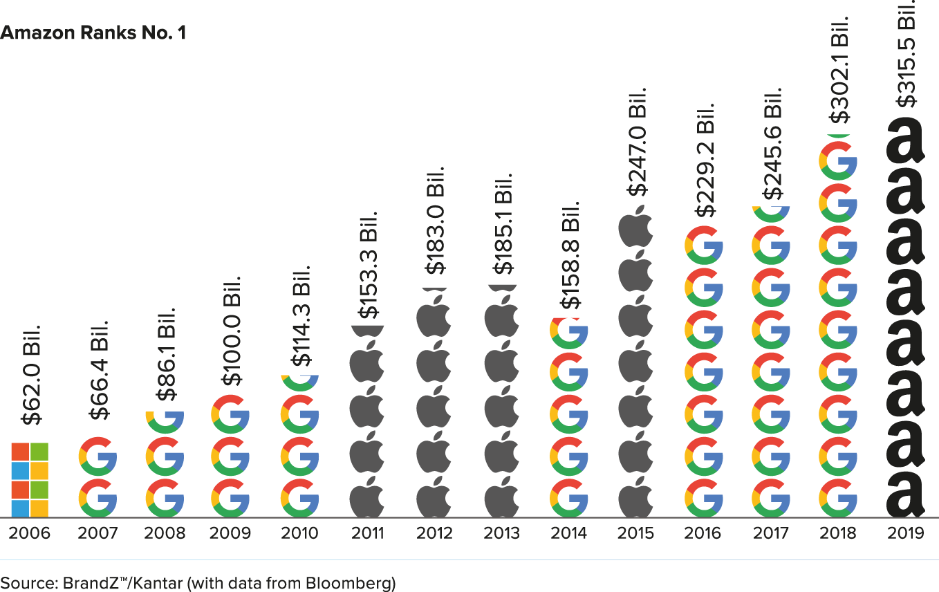 2006年から調査が開始され、2019年は14年回目となる。調査開始の2006年に、Microsoft(マイクロソフト)がブランド価値ランキングでトップの座を獲得して以来、「BrandZ Top100」にランクインするブランドの大半はテクノロジーブランドだった。12年にわたって1位を保持してきたそれらテクノロジーブランドに代わって、アマゾンが堂々1位に輝いたことになる。