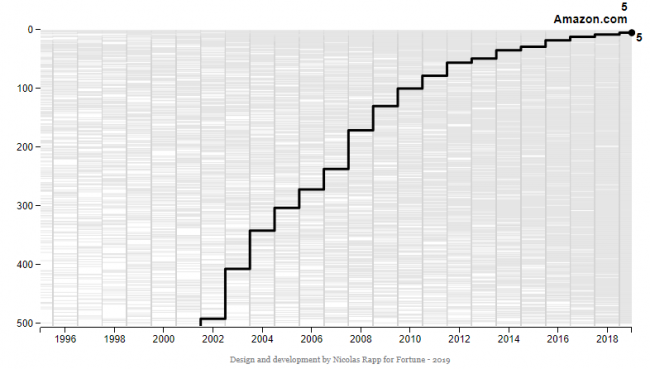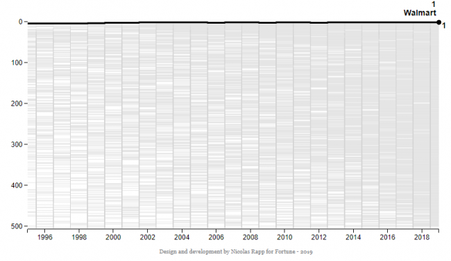 アメリカ全企業のなかで、トップは今年もウォルマート。下の図は1995年から2019年における「FORTUNE500」の順位変動を表したもの。これを見ると、ウォルマートがコンスタントに1位ないし2位の座を守ってきていることがわかる。