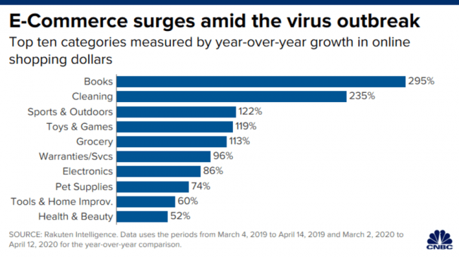マーケット・リサーチ会社「ラクテン・インテリジェンス」によると、3月初めから4月半ばの期間で、米国のeコマースは、前年比で30%以上増加した。