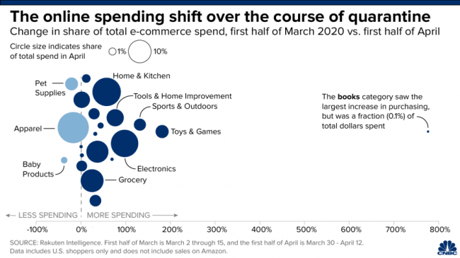 購入商品別で見ると、書籍295%増、清掃用品235%増、スポーツとアウトドア商品122%増、玩具とゲーム119%増、グロサリー113%増、さらに修理交換保証とサービス96%、家電86%、ペット用品74%、DIY用品60%、美容健康用品52%と、それぞれ前年度比で売上高が増加している。ただし、この数字にはeコマースの約半分を占めるアマゾンの売上高は含まれていない。
