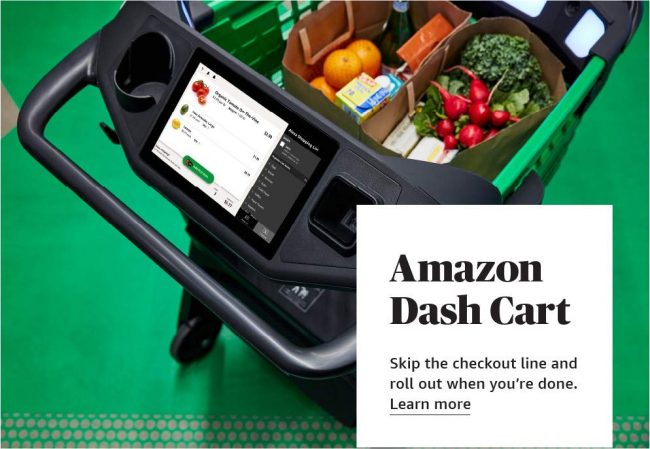 売場を巡って、商品を選択し、購買商品をダッシュカートに入れると、コンピュータービジョンが自動的に商品を認識する。あらかじめアレクサで買物リストを作成しておけば、カートのスクリーンに表示される。いちいち商品バーコードをスキャンする必要はない。