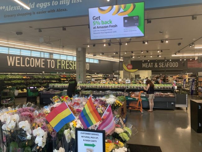 6月17日に開店したファクトリア店は、「アマゾン・フレッシュ」14店舗目。一般的な食品スーパーマーケットの品揃えに加え、アマゾン傘下のホールフーズ・マーケットのプライベートブランド「365」も扱う。