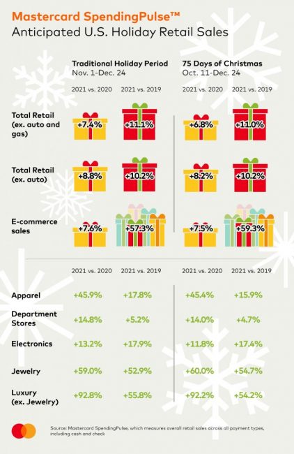 マスタカード・スペンディングパルス(MasterCard SpendingPulse)は、2021年のホリデー商戦(11月1日~12月24日)の売上高は前年度比7.4%増加するとの予測を発表した。