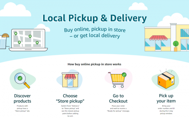 現在、アマゾンで販売される商品の半分以上は第三者セラーが出品する商品で、そのほとんどが中小企業である。アマゾンのストアサイトに商品を掲載している出品者は、Amazon Local Sellingを使用することにより、対応エリアの顧客であれば、注文したその日に指定店舗での受け取りサービスを提供することで、自社の商品をすばやく簡単にマルチチャネルで拡張することが可能となる。一方、同サービス対応エリアの顧客は注文時に「店舗受け取り」を選択することで、商品の準備ができ次第、最短即日に商品を受け取ることができる。もちろん、配送を選択することも可能だ。