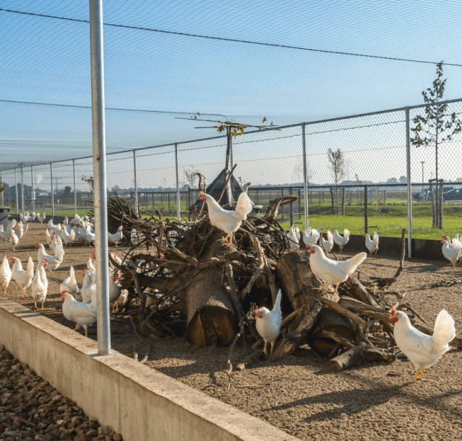 キプスター社の農法では、動物愛護を考慮した最高水準の施設として、屋根にソーラーパネルを設置し、浮遊粒子物質を最低限に抑えた換気システムを導入している。また製パンなどの食品加工工場で余った食材を元にした飼料を与え、ケージフリーな環境で飼育している。