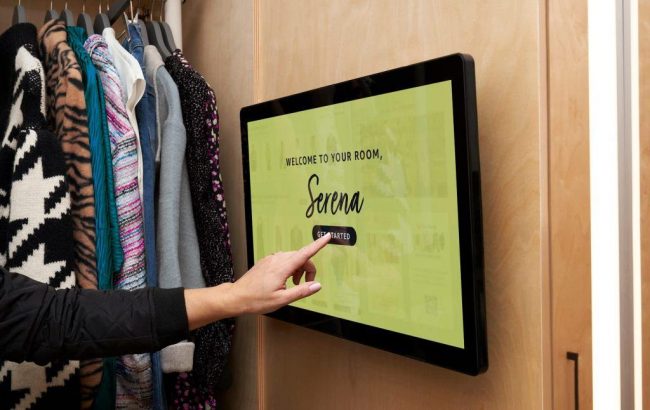 店内では、スマートフォンを使った買物経験を提供している。商品に付けられているQRコードをスマホでスキャンし、サイズと色を選ぶと、商品が担当社員によって試着室に届けられる。なお、事前にオンラインで選んでおいた商品を、来店時に試着するということもできる。試着室内にはタッチパネルが備え付けられており、他の商品の試着リクエストやAIによる商品提案を確認することもできる。