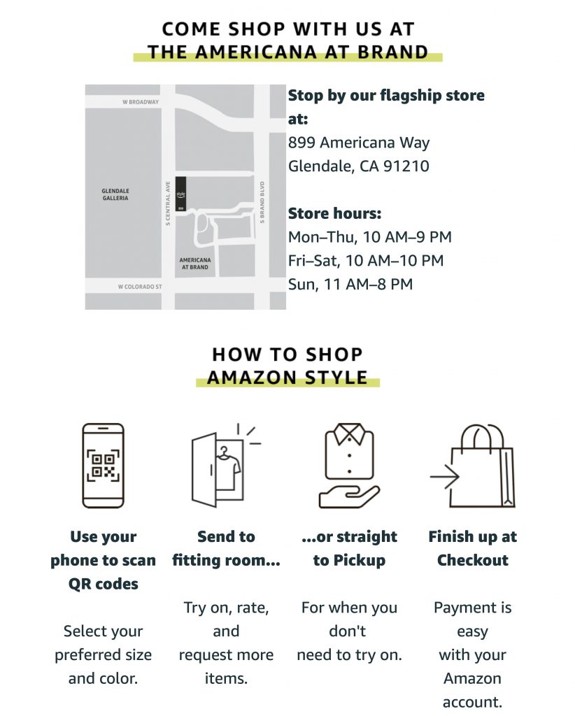 今後の「Amazon Style」の出店計画は発表されていないが、一昨年のウォールストリートジャーナルの報道では、オハイオ州コロンバス、サンフランシスコが開店候補地として挙げられている。売場はあくまで陳列のための「ショールーム」で、実際の商品在庫はバックルームにある小型フルフィルメントセンターに保管されている。商品はAmazonのフルフィルメントセンターで使われている需要予測のアルゴリズムで集められると説明されており、サイズも加えると相当な在庫数となる。