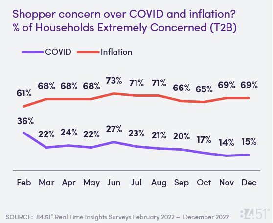 「コロナとインフレに対して懸念を抱いている消費者の割合」は、インフレが2022年2月の61%から12月には69%に増加している一方で、コロナは36%から15%に落ち着いている。つまり、アメリカの顧客はコロナよりもインフレでの高価格に対して、不安を強く感じていることがわかる。とくに世帯年収が5万ドル(100円換算で500万円)以下の世帯では、74%が非常に懸念している。
