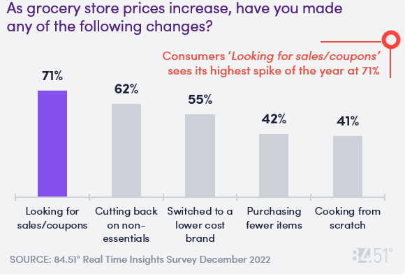 また「商品の値上げに伴って、買物行動に変化は生じているか」という問いについては、71%が「セール品やクーポンを探す」、62%が「生活必需品以外の購入を減らす」、55%が「低価格ブランドを購入する」、42%が「買い上げ点数を減らす」、41%が「(ミールキットなどを使わずに)一から調理する」ようになったと回答している。