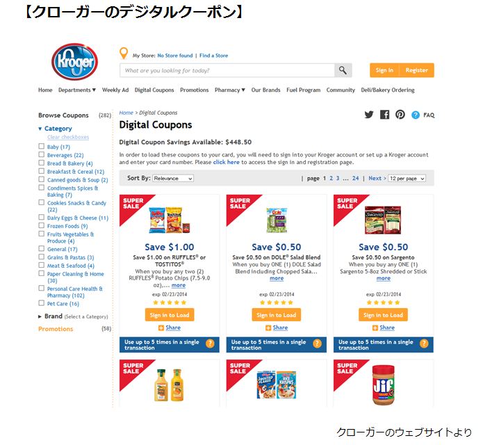 クローガーのデジタルクーポンは、顧客が同社のウェブサイトにログインして、自分のFSP(フリークエント・ショッパーズ・プログラム)「Kroger Plus Shopper’s Card」のアカウントにダウンロードする仕組みだ。
