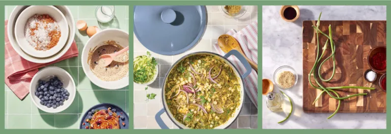 <左から5個セットのセラミックのミキシング・ボウル(30ドル)、青色の鋳鉄のホーロー鍋(約7.3リットル入りが70ドル、約5.2リットル入りが60ドル)、アカシア材でつくられたまな板(30ドル)>