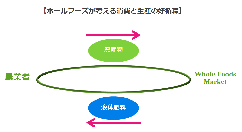 オーガニック&ナチュラルの切り口から、循環型農業生産へと領域を広げ、さらに店舗廃棄物から有機肥料を生産して、それを農家に販売し、さらに有機農産品生産に結びつける。
