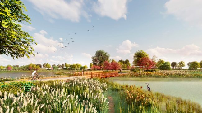 キャンパスの半分は緑地で、5000本の植樹を含め75万本以上の在来植物が植わっていている。そしてキャンパスの南側には、13エーカー(約5万2600㎡)の湖「South Lake」がある。展望台や遊歩道、サイクリングコースといった楽しみ方ができる一方で、雨水管理システムの重要な構成要素として機能している。雨水と地下水を効率的に捕集して浄化する設計となっている。高度な技術を備えた貯水池は、雨期には洪水を軽減することができ、逆に干ばつの時期には、地域コミュニティに水を放出することができる。