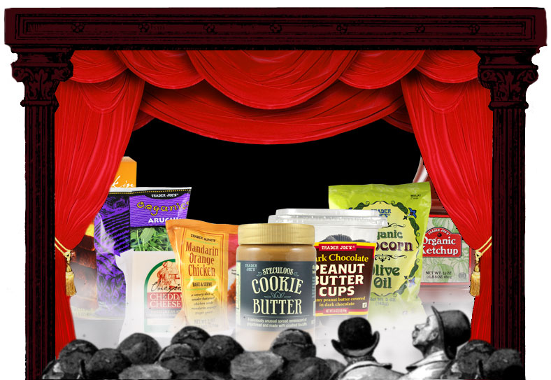 聴衆が見つめるステージに商品が並んでいる絵が、トレーダー・ジョーらしくて面白い。