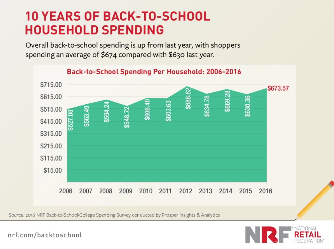 幼稚園から高校3年生までの子供を持つ世帯のバック・トゥ・スクールの支出額は、総額758億ドル(100円換算で7兆5800億円)。2015年の680億ドルから11.5%増加となった。