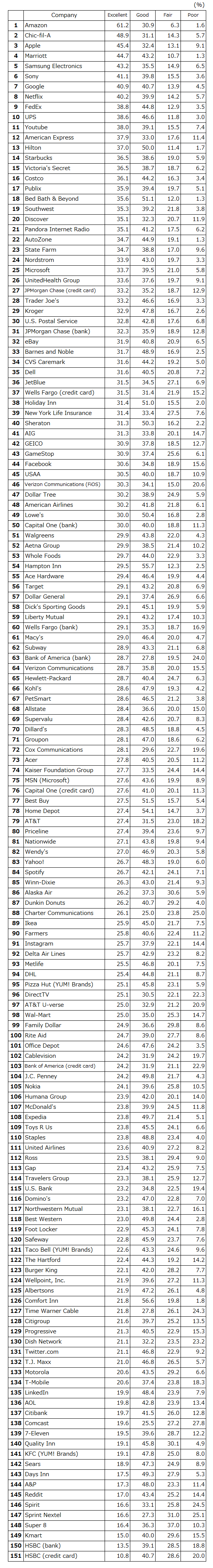 1位はアマゾン。61.2%の回答者が「Excellent=素晴らしい」サービスを経験したと回答。有料会員サービス「Amazon Prime」の強化やドローン配達サービス「Prime Air」導入などで、会員数の増加に力を入れている成果が表れたものといえる。回答者の50%を超えたのは唯一アマゾンのみ。
