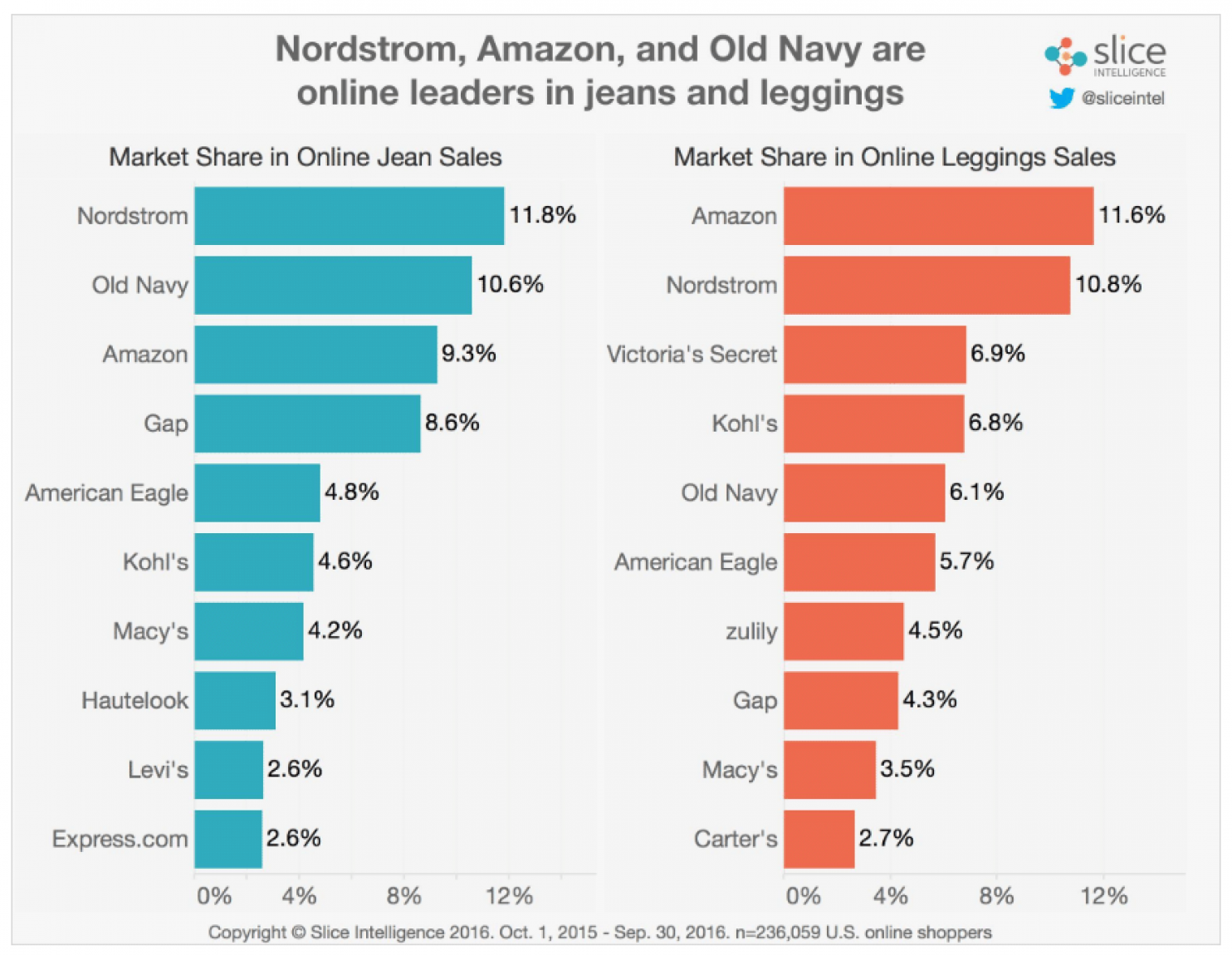 表のとおり、ジーンズでは1位がノードストローム(デパートメントストア)11.8%、2位がオールドネイビー(アパレルリテーラーGAPの低価格フォーマット)10.6%、3位がアマゾンで9.3%。GAPやコールズ、全米ナンバー1のデパートメントストア・メイシーズやジーンズ専門店リーバイスなどを抜いている。