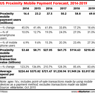 調査会社EMarketerは、2016年度のモバイル決済取引額は昨年の3倍以上の270億ドルにのぼると予測している。