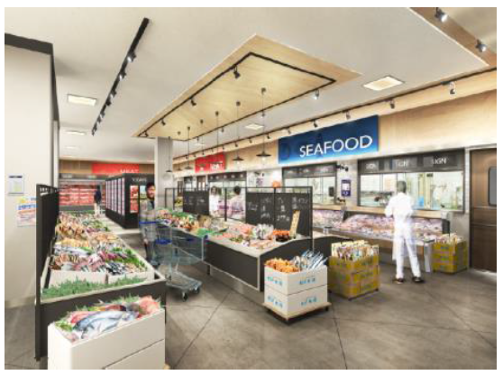 1階はレジとお客様カウンターのみ。2階、3階が売場になる。2階には築地直送の魚介類をはじめとする肉や野菜などの生鮮食品を、3階にはメトログループが蔵元と共同開発した低価格ワインや直輸入商品をくくることで、効率の良い仕入れを促す。また、売場に接する形でカフェやワインカウンターを併設。